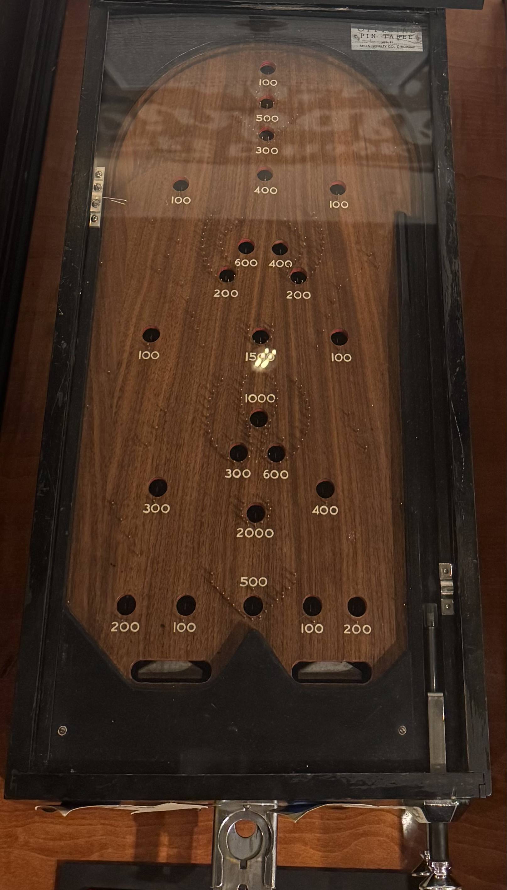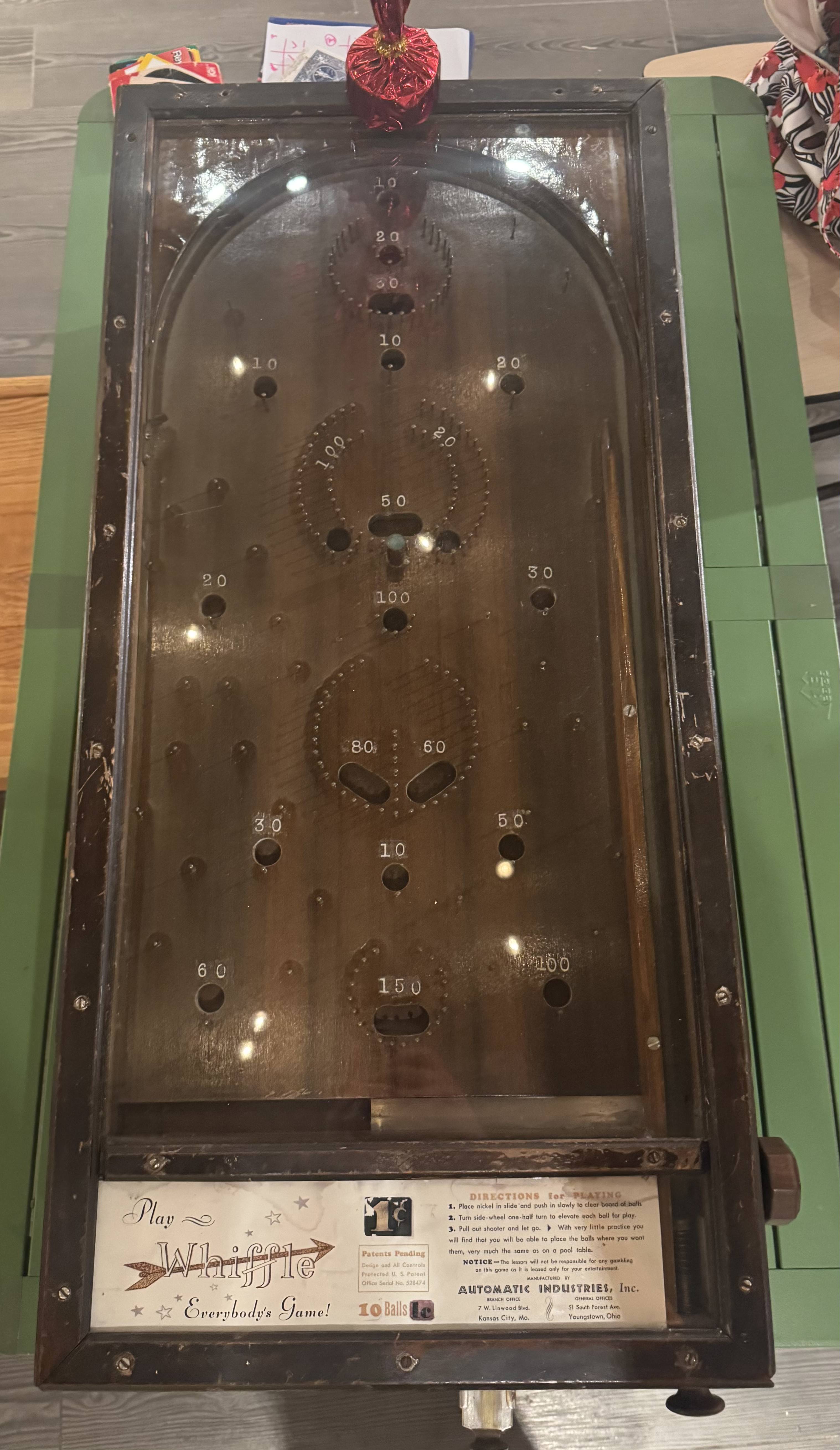Widely considered the first pinball machine ever made. Whiffle took the bagatelle format and commercialized it by adding a coin slide and glass on top!